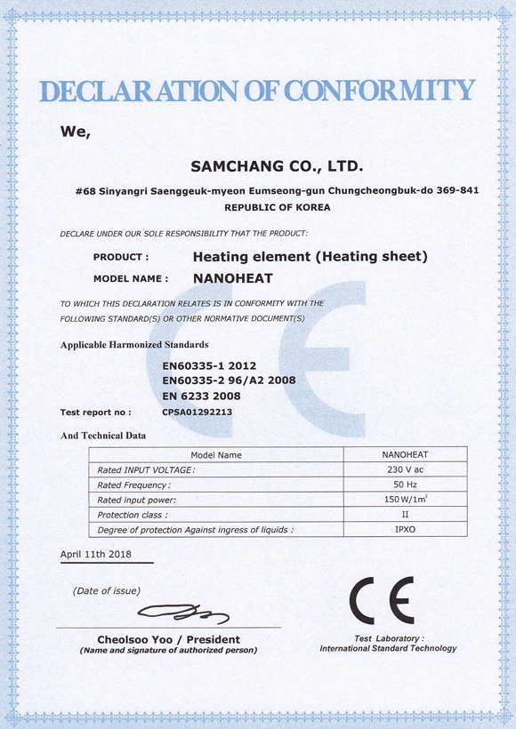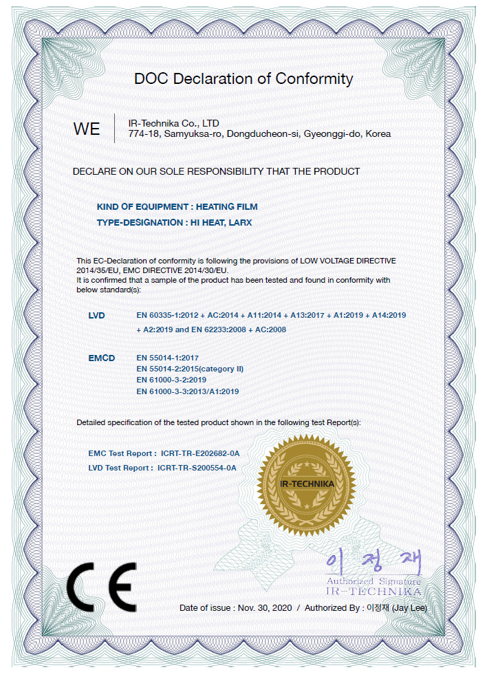 Deklarace korejského výrobce o splnění všech norem LARX uhlíkové fólie, včetně IP krytí.